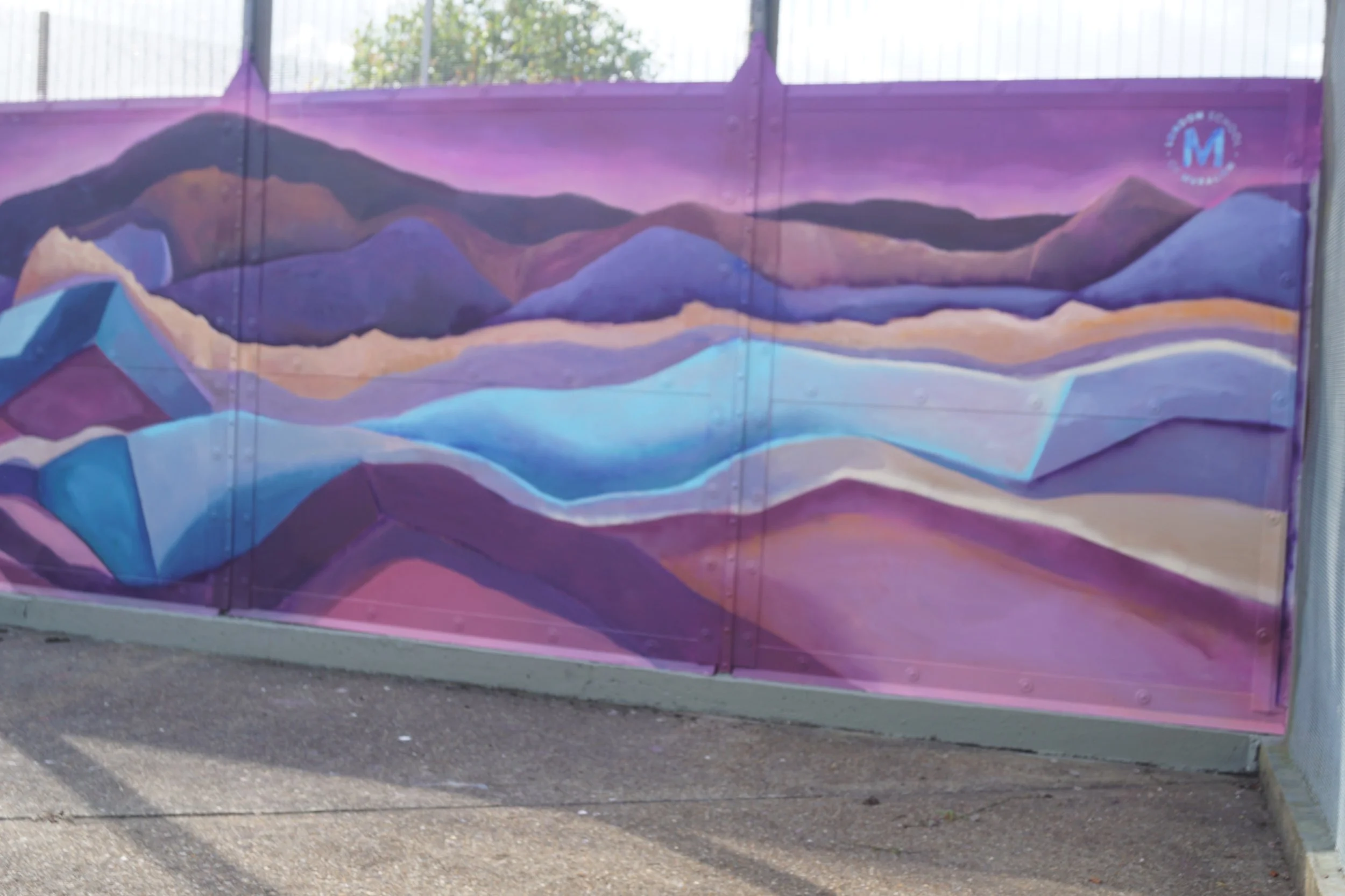 The final piece depicts a bold mountainous landscape, built with zig-zagging layers of colour and texture. It transforms the environment into something lighter and more hopeful, bringing creativity and expression into a space that can often feel heavy and restrictive.
